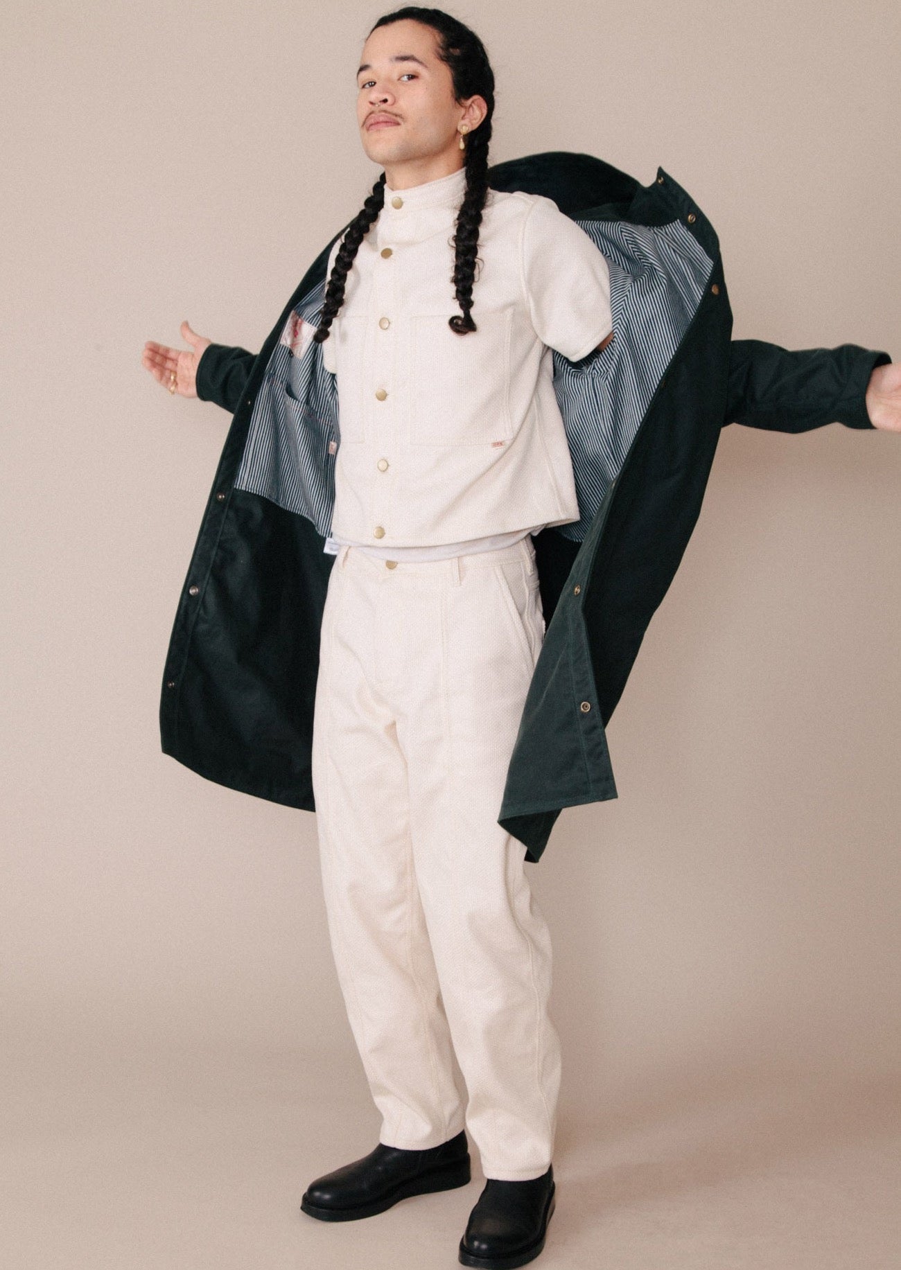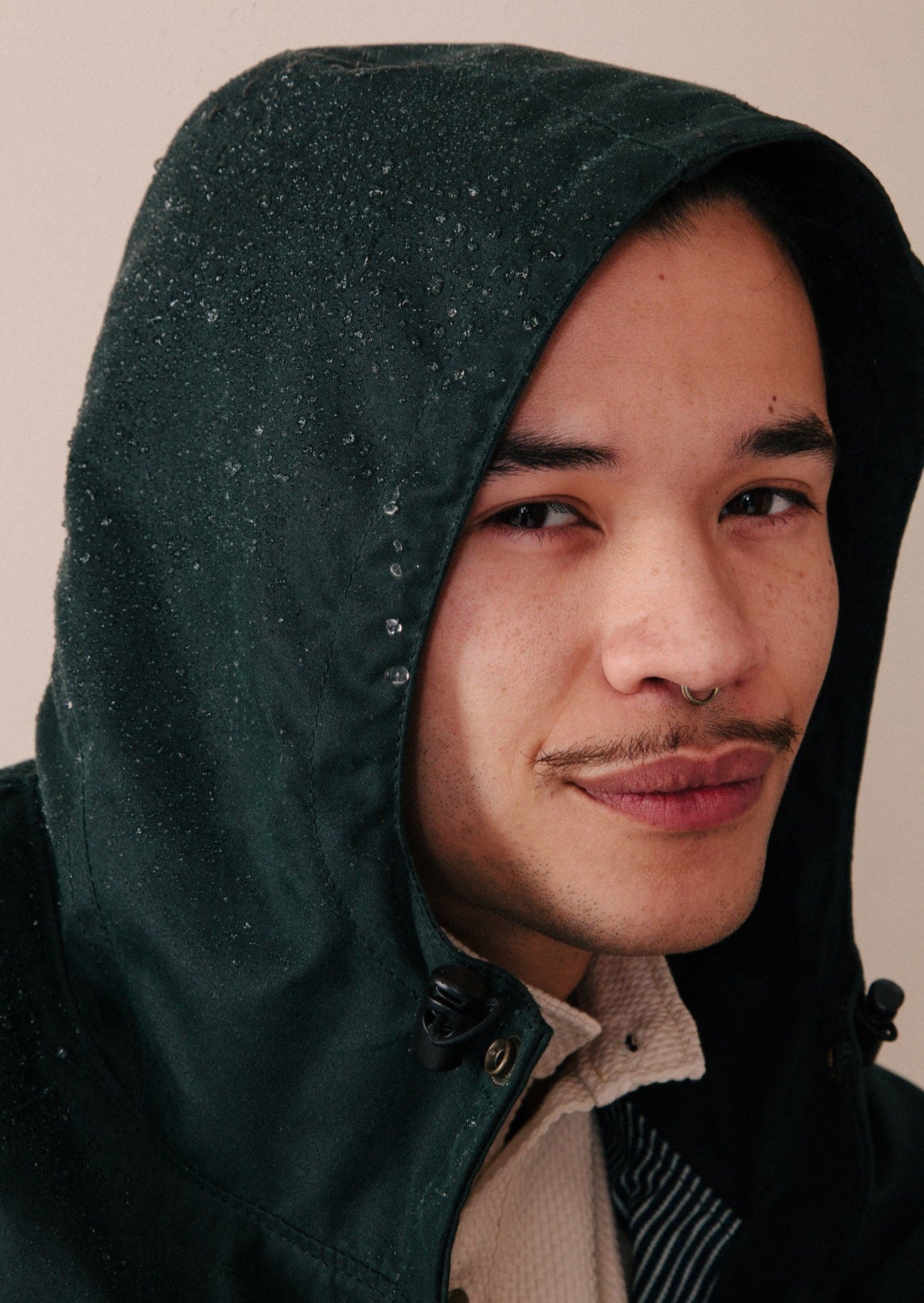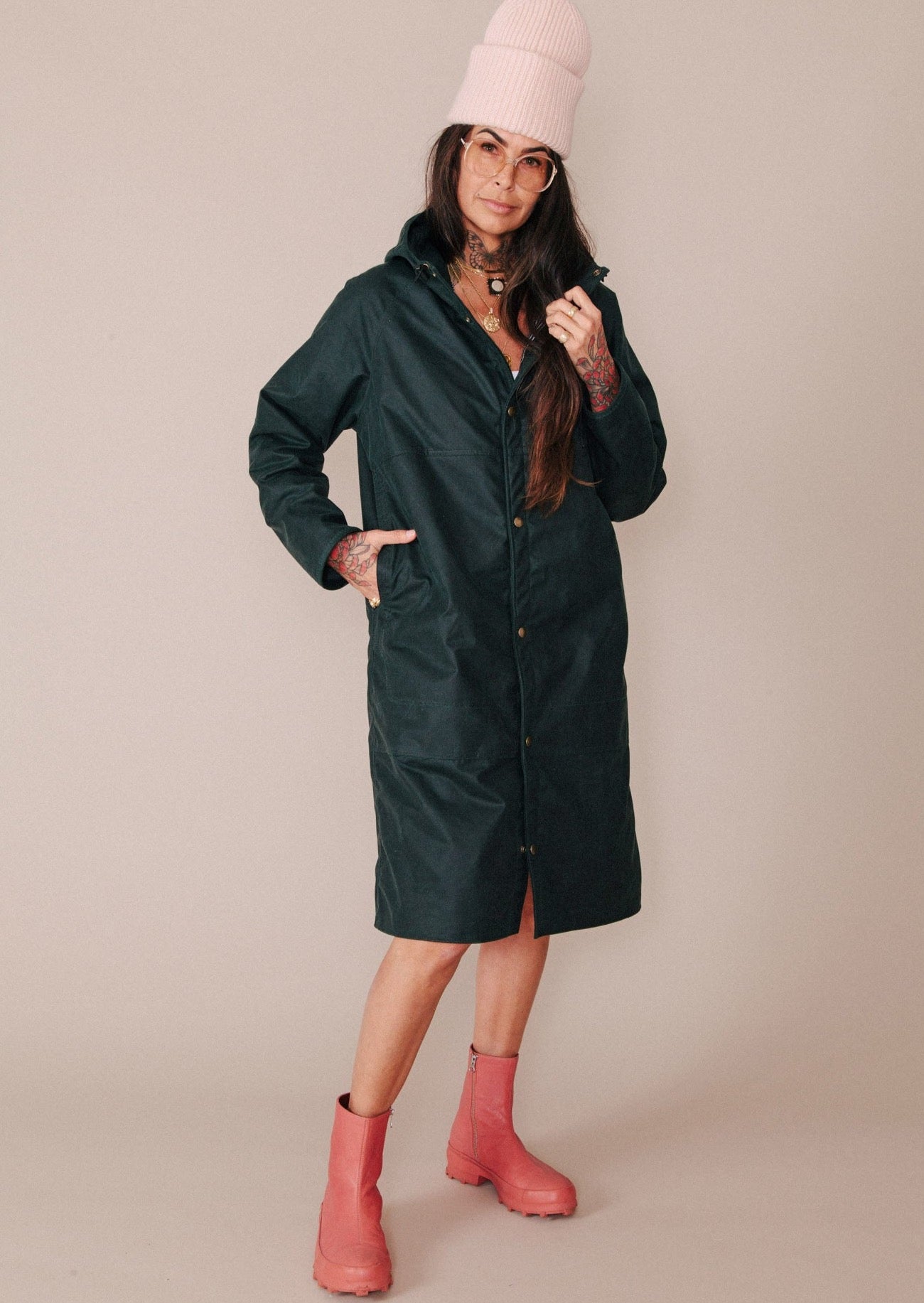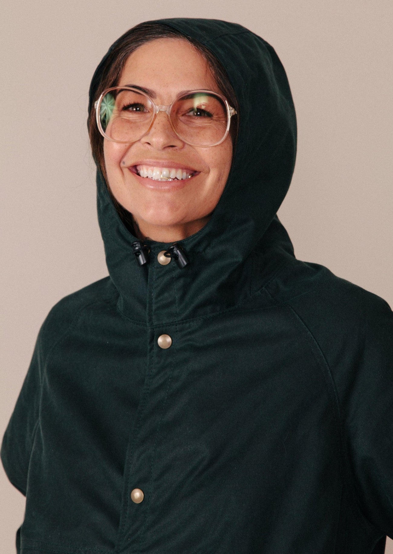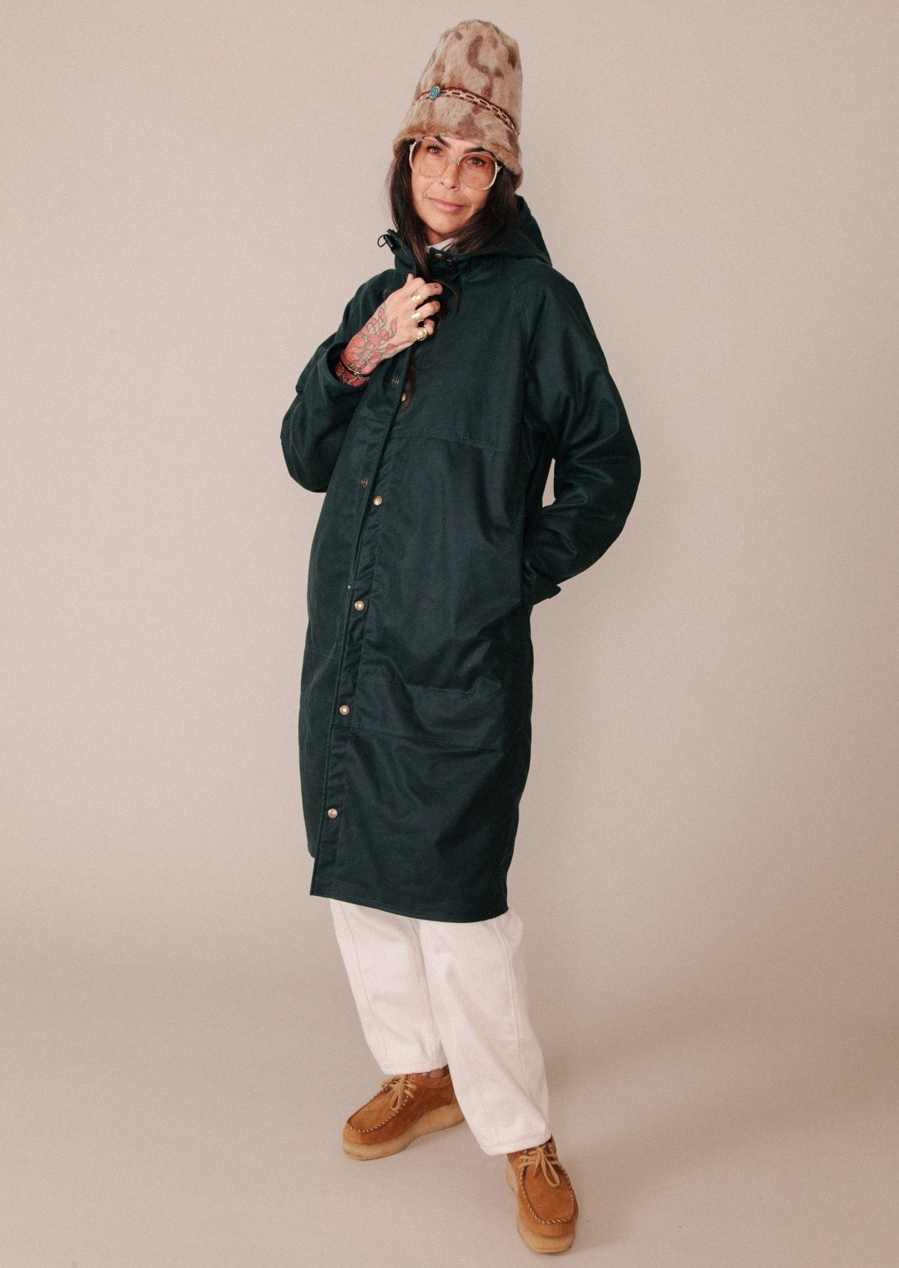 Almost named the "call me in april coat" The 100% Chance Rain Coat is a knee length, durable, hooded rain jacket designed for those heavy rain and all weather seasons. Sewn with a high quality emerald green traditional oilcloth shell and a 100% cotton railway stripe liner, this jacket will keep you buttoned up and dry for all that hardcore October-April rain. As always, made for a good time, handmade to last a lifetime, this rain jacket is meant for cruising around the city, riding your bike to work, or going on a forest walk. This jacket comes in two sizes: Small/Medium and Large/Extra-Large. Be sure to take your measurements and check out the sizing chart to order the perfect fit.