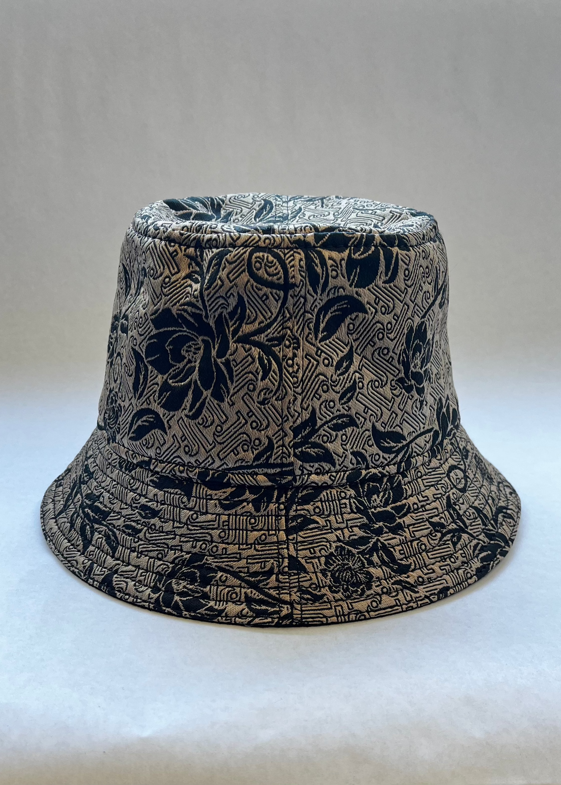 This unique piece is a play off of the Tall Jada hats, its slight shorter in height and brim length. The shine and shape of this hat instantly make it runway-worthy and ideal for those with impeccable style and a fondness for standout hats. It is meticulously crafted from a beautiful up-cycled jacquard, featuring a gold metallic floral design. Versatile enough to dress up or down, this hat truly embodies fashion.