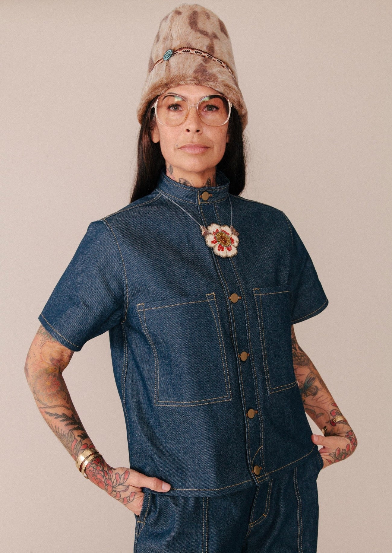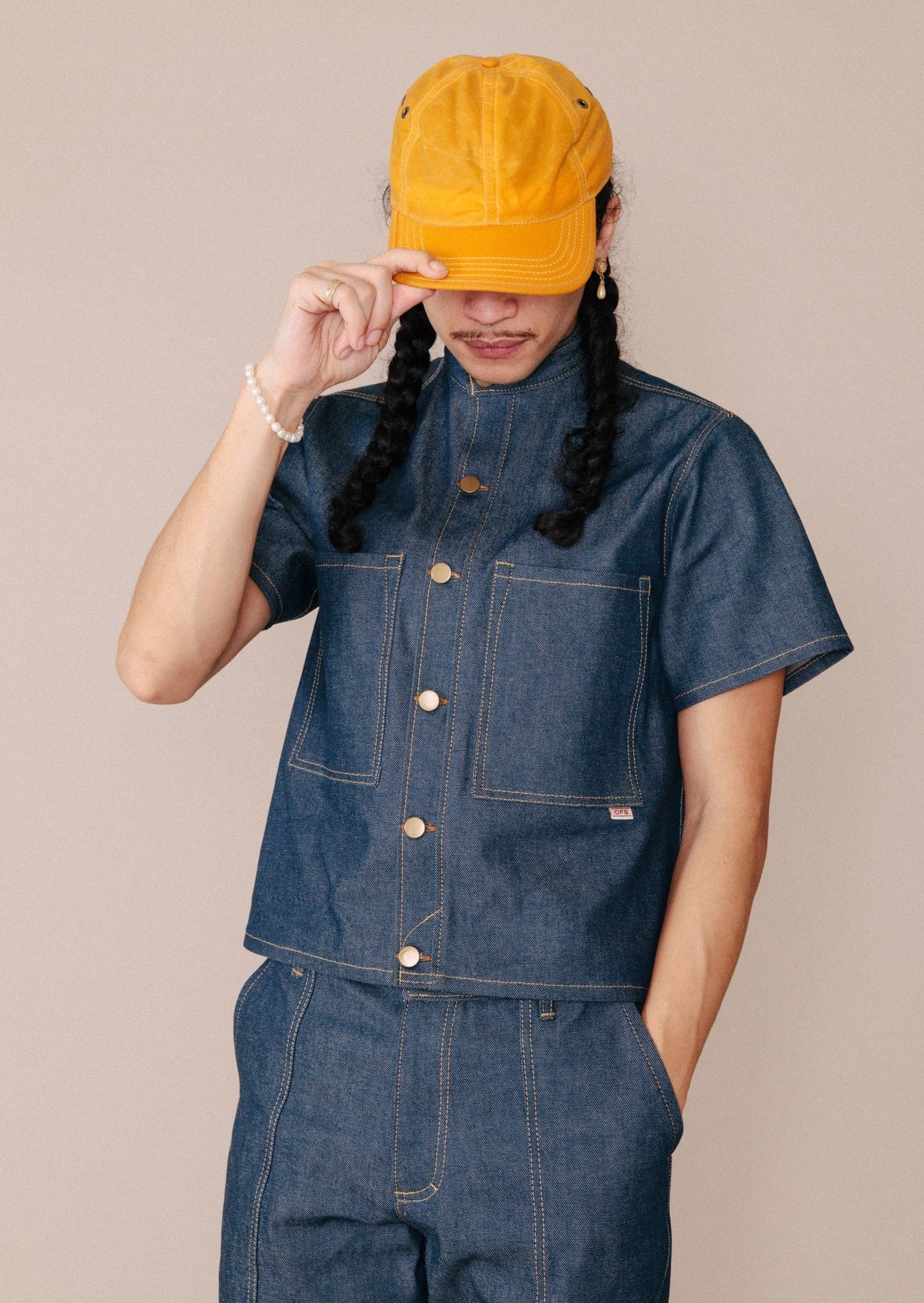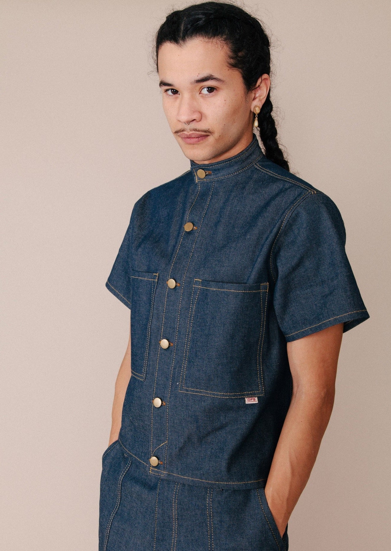 The Table for Two Top is a dressed-up mock neck shirt, designed to be the perfect dinner date top. Made with the highest quality Japanese natural indigo selvedge denim, this short sleeve button-up has two front pockets and polishes up your look so you feel cute as heck going to meet your honey for a reservation at your favourite restaurant.