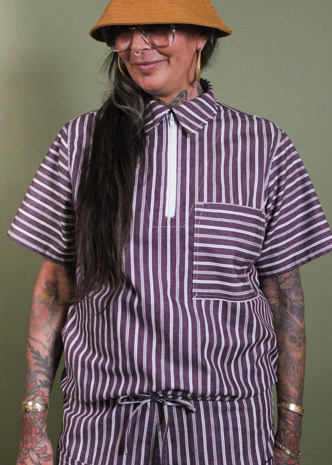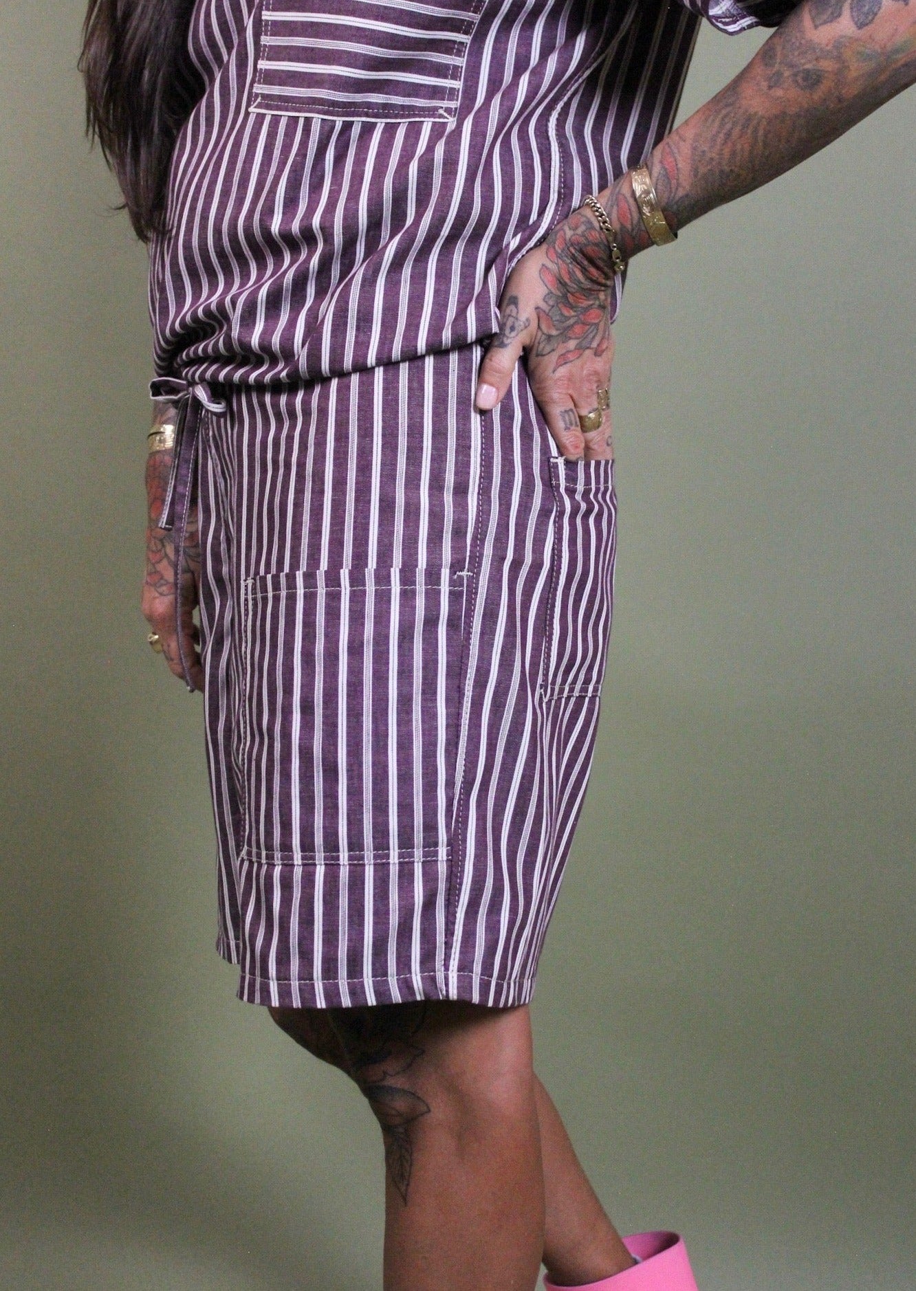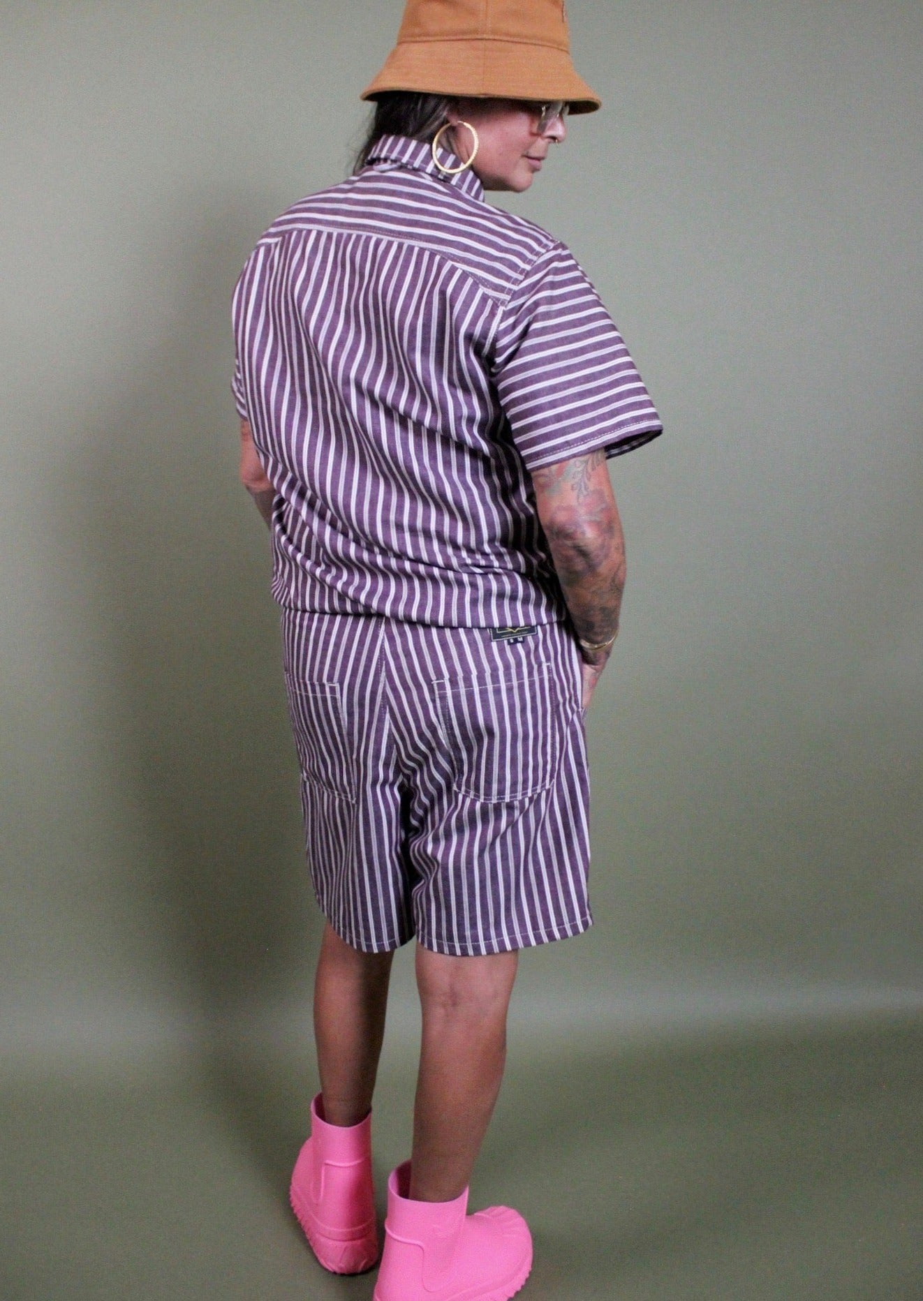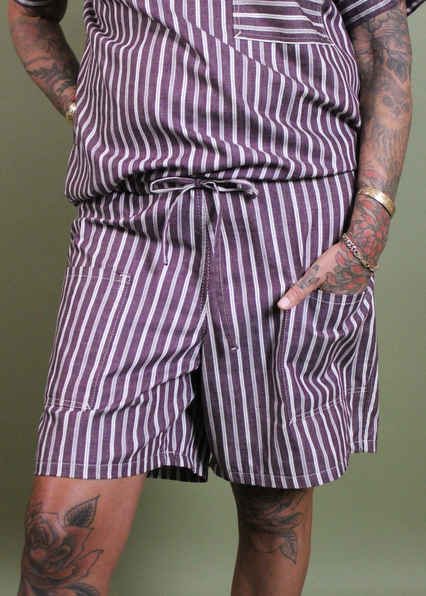 Light weight, casual, warm and approachable. This striped set is airy and perfectly suited for summer. Generous fit constructed from striped up-cycled 5 oz cotton. Shirt cinches at the hem ensuring a flattering fit on a wide variety of bodies. Matching shorts have a wide elastic waistband, flat felled seams and two square drop pockets in the front and back; inspired by vintage boxing shorts (think Mike Tyson not underwear).