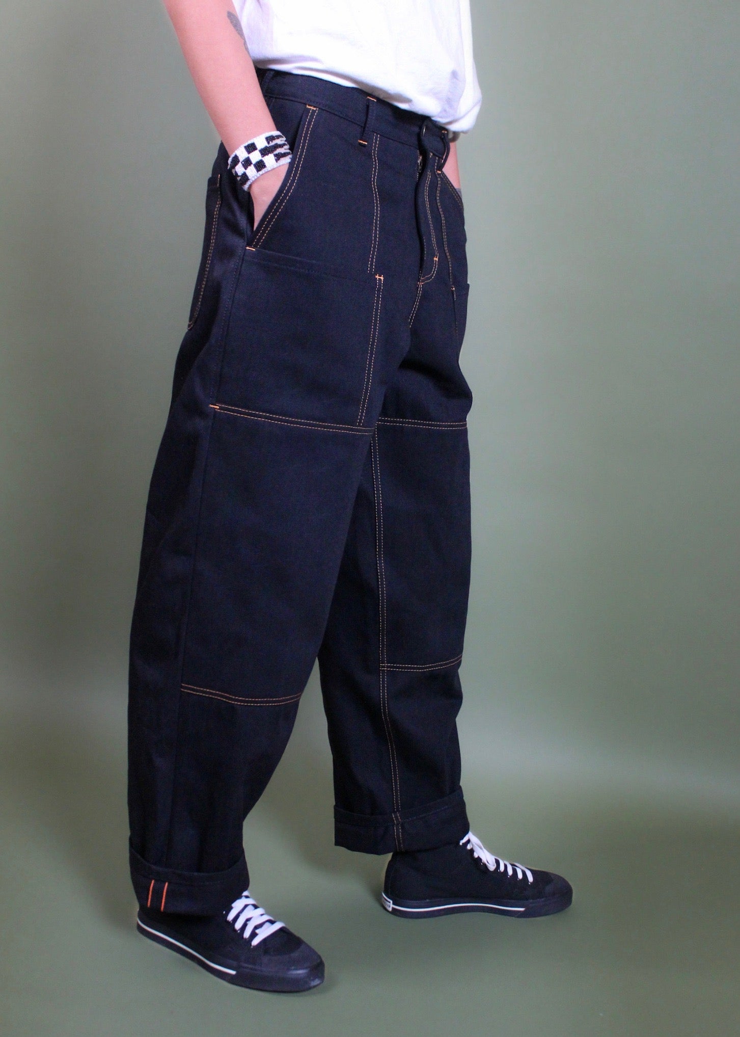 Bottoms: Raw dawg baguettes are perfection; they hold that delicate balance between all bagginess you want in the leg with a waistband that actually fits. The Baguettes, like all our products, are a gender fluid pant – and here’s the secret of these traveling pants: somehow they specifically honor those wonderful hips and bottoms, yet also fit great on those with thin and narrow wonders. Size 32 x 30