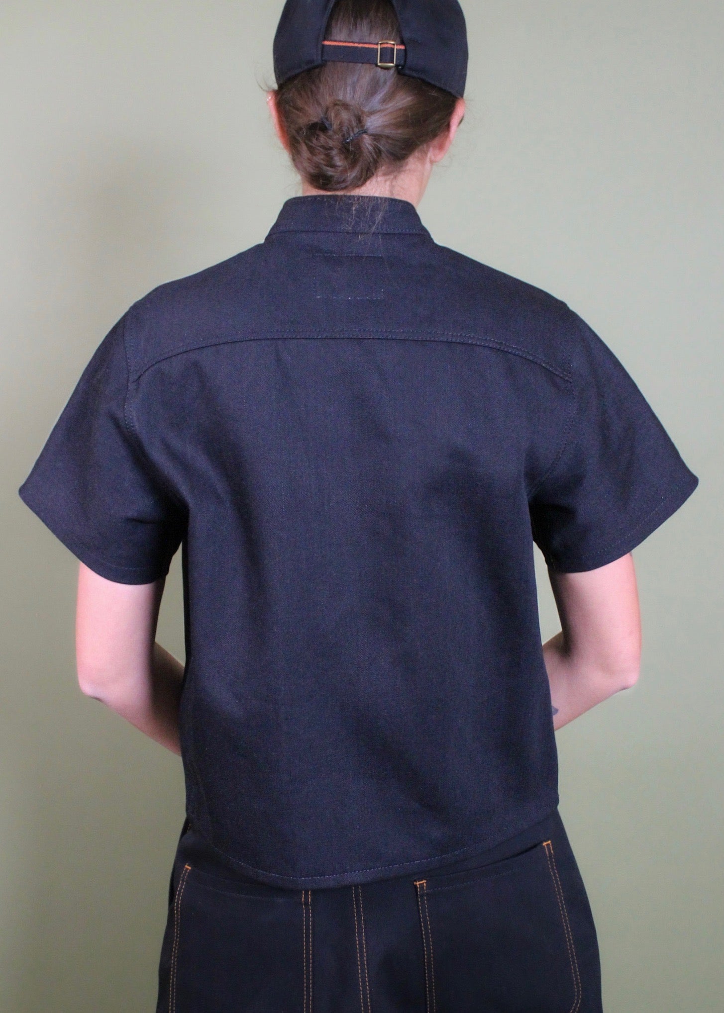 Top: We call this our Table for Two Top. It’s a dressed-up mock neck shirt, designed to be the perfect dinner date shirt. You’re gonna feel cute as heck when you arrive at your favourite restaurant to meet your honey; made from the highest quality Japanese selvedge denim, this short sleeve button-up has two front pockets for a polished and inviting look. Size Small