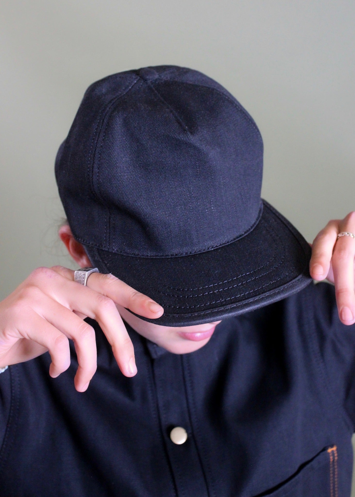 Hat: We’re loving our new taller and bigger 5 panel cap. This one is a staple, an all black hat with the orange selvedge peeking through on the adjuster strap and cut from 13 oz selvedge black denim. The flat, slightly square brim is a subtle flex offering exceptional shade and boasting pure style. The orange selvedge peeking through on the adjuster strap are just the sort of details that OFS has become known for: a perfect balance of contrast and matching. Each seam is taped using our 1915 era double needle chainstitch machine sewn with black nylon bonded thread. One size