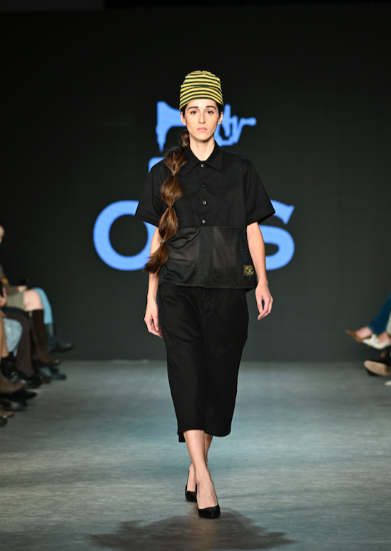 Hat: OFS celebrates the early millennium with upcycled fabric playfully constructed into a new 6 pleat striped toque. While we’d love to make more we only had enough fabric to make five of these hats so jump on it while you can as this garment is a very limited edition. Wear it tall or hugging close to your head; this accessory finishes your outfit with a unique touch. Two sizes