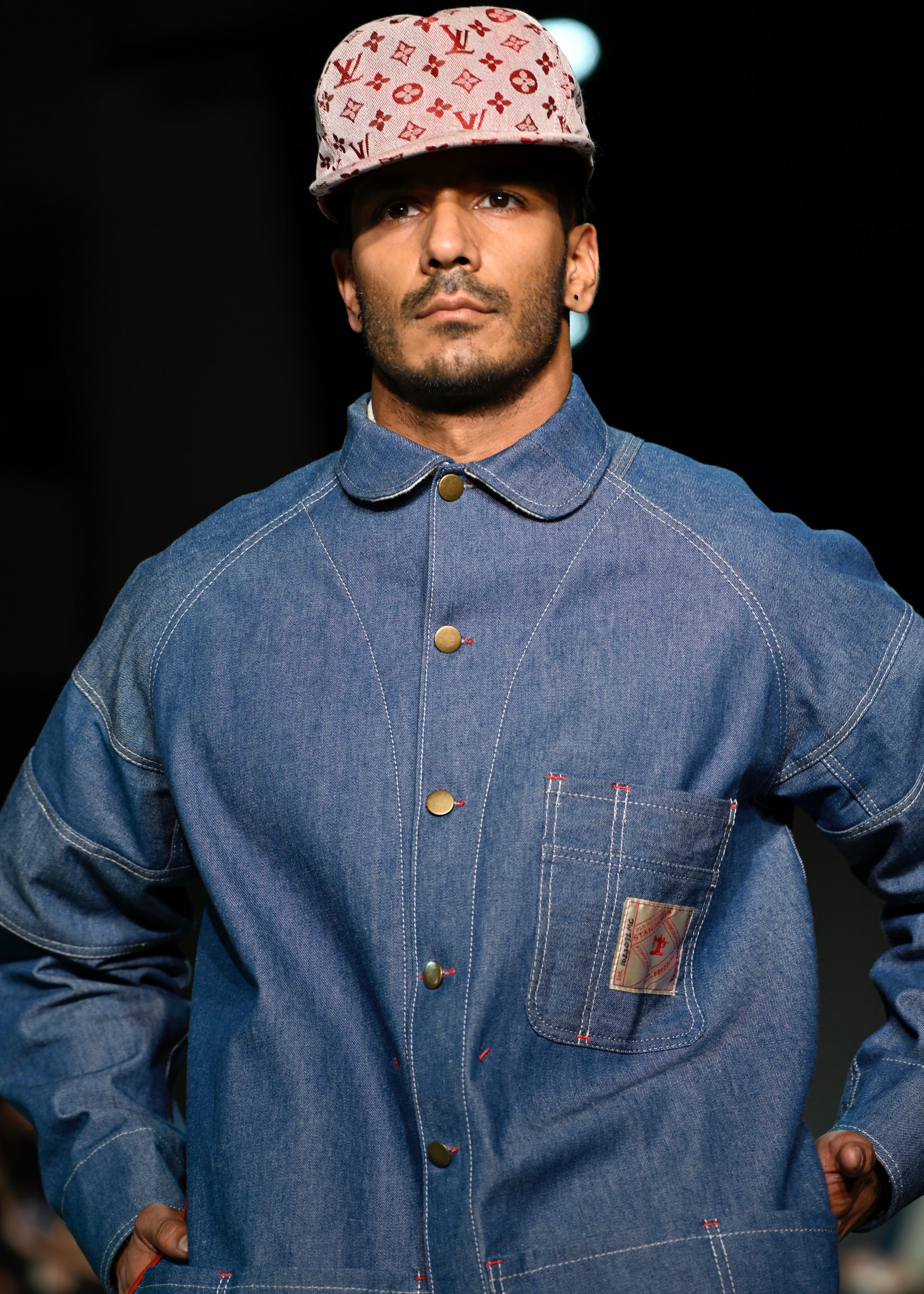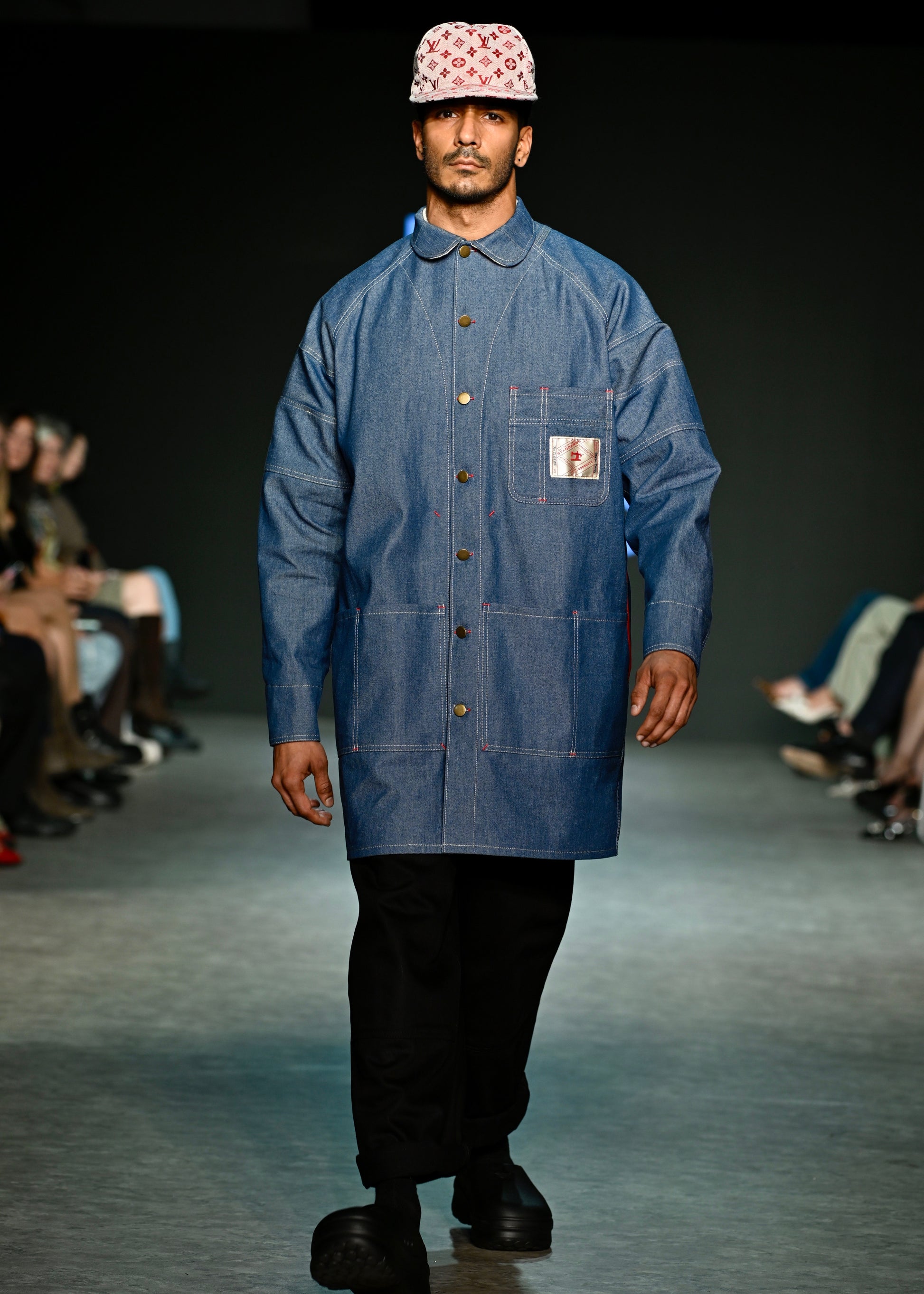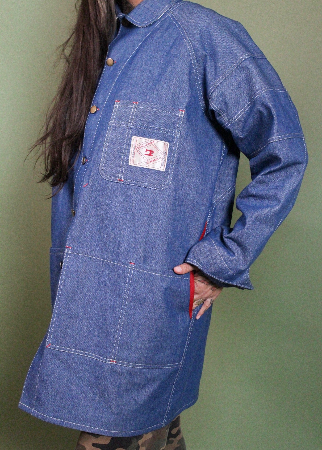 A slightly oversized knee length chore coat cut from a mid weight up-cycled slub denim. A proper curved edge collar with a sightly curved front vertical yoke creating flattering stitch lines and button placket. With curved side entry pockets, a left chest and two lower drop pockets and a straight hem. A generously tailored two piece sleeve featuring segments of patchwork ending in a rounded cuff bottom. With notes of red thru out the jacket by way of bar tac's and curved pocket bias tape matching the hat perfectly. The Chore coat is unlined with a combination of flat felled and overlock seams all double topstitched thru out. This Jacket in this specific denim is one of one and fits small to large.