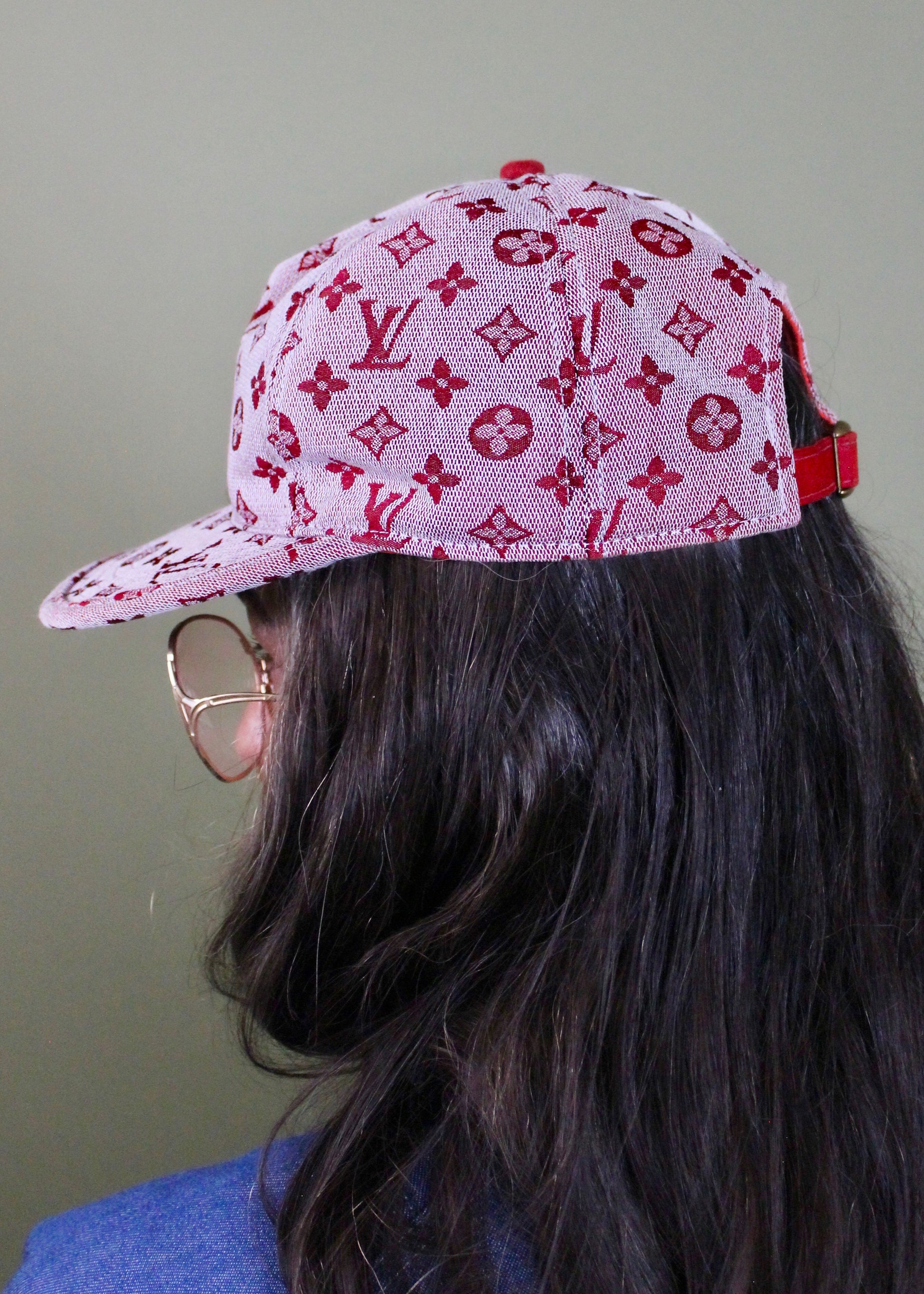 Our new tall and bigger 5 panel cap cut from a mid - light weight up-cycled red Jacquard. Features a flat slightly square - ish brim ideal that offers exceptional shade and style. With a red oilcloth button and adjuster strap it adds the OFS trademark of contrast and matching. Each seam is taped using our 1915 era double needle chainstitch machine sewn with white nylon bonded thread to pop yet match the Jacquard.