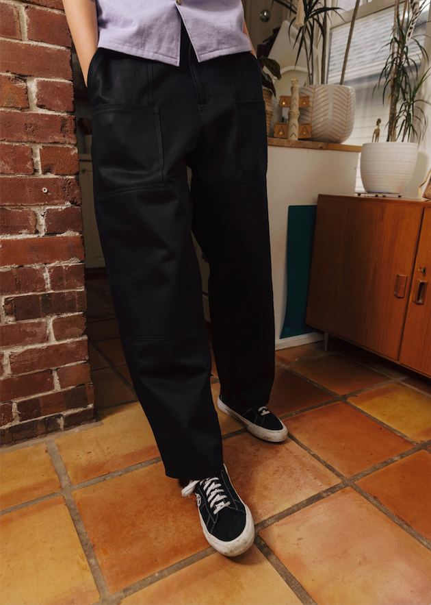The Baguette baggy yet fitted in the waistband cut from 13 oz black denim woven in the usa. The front features two slanted pockets that are layered under two square patch pockets sealed up by the double knee extra layer. The back yokes are shaped to create a very nice shape in the rear and is accompanied with round corner pockets. All the bag in the leg you need, yet properly fitted in the waist. Double topstitched thru out this jeans will last you many years to come.