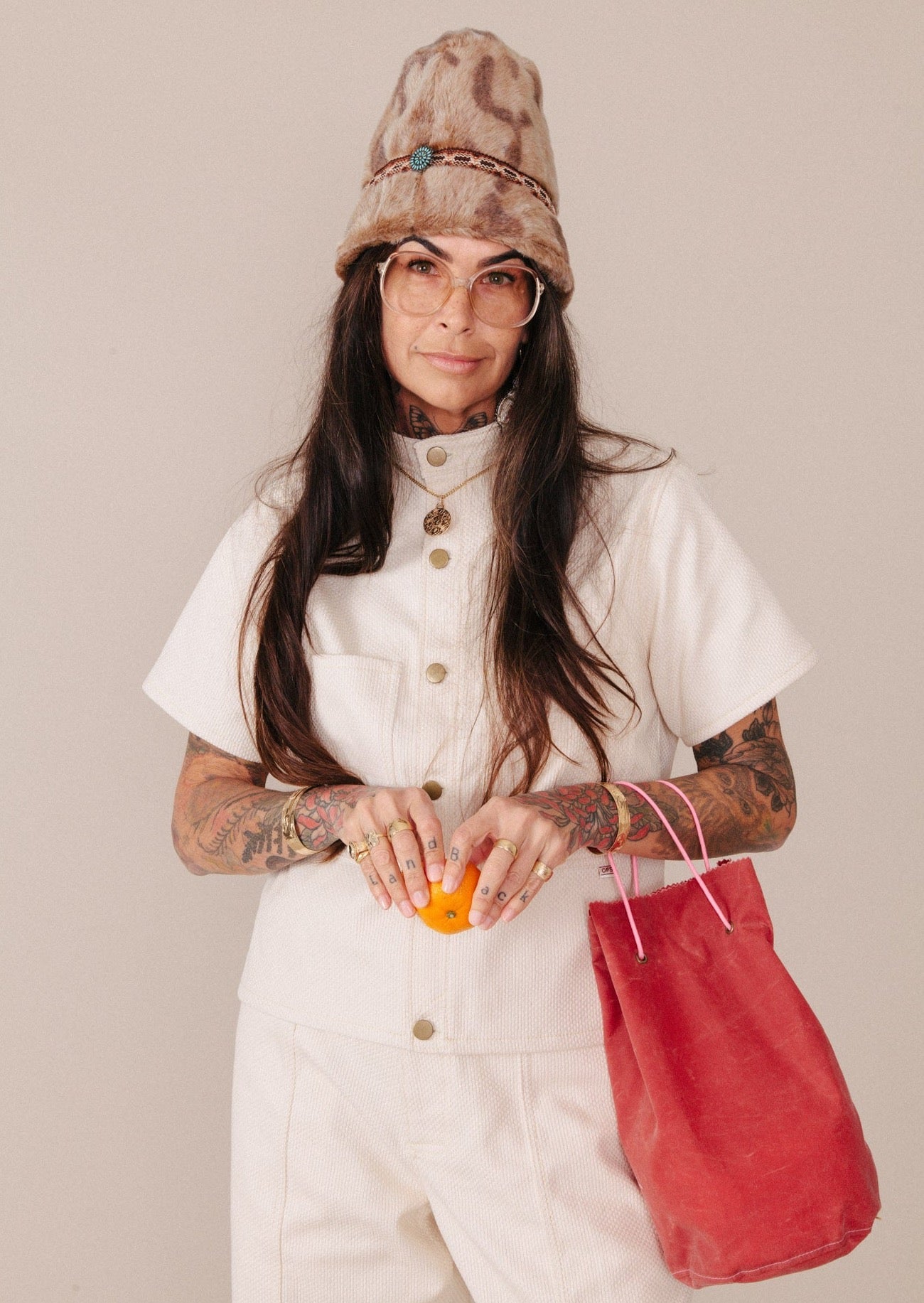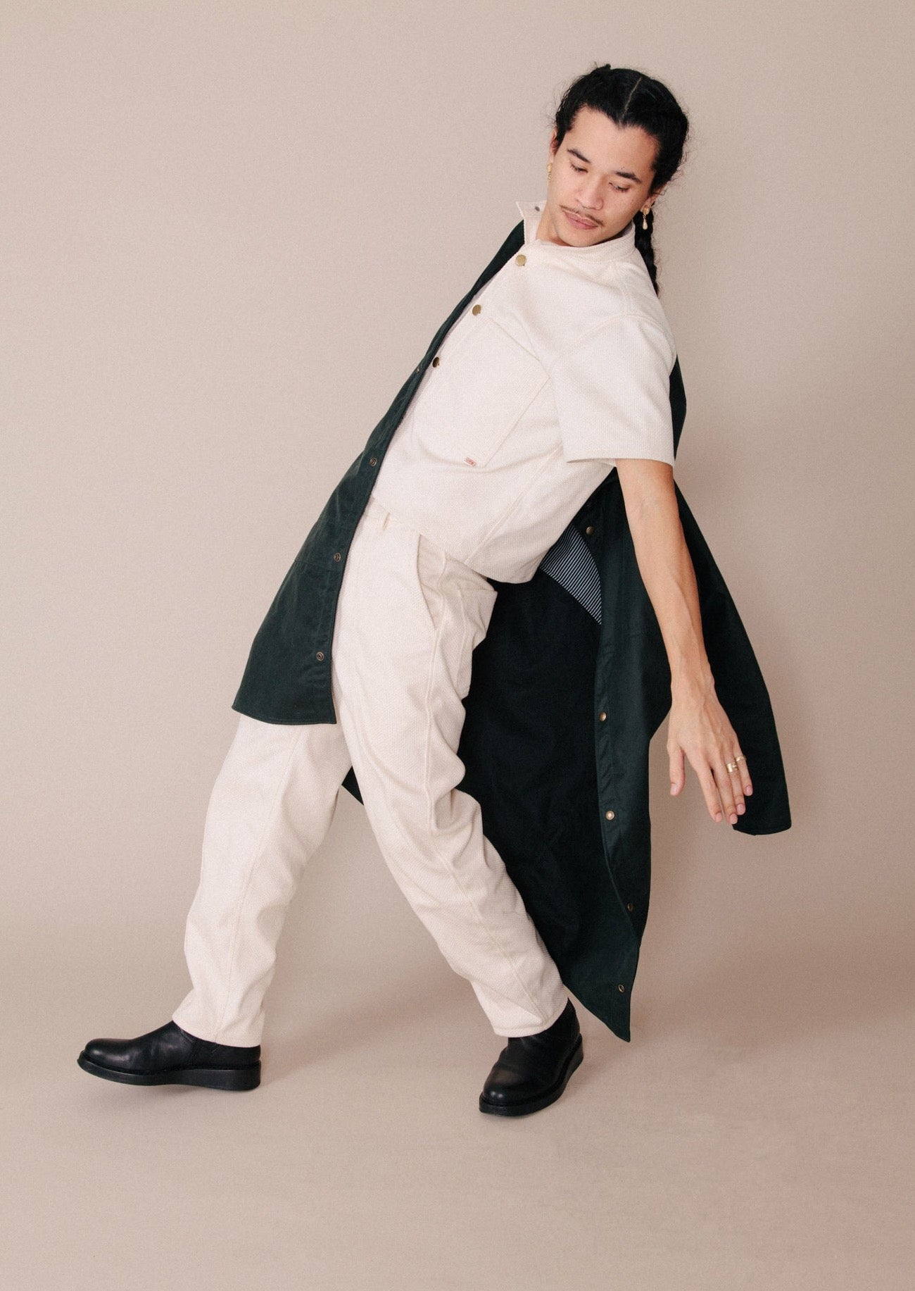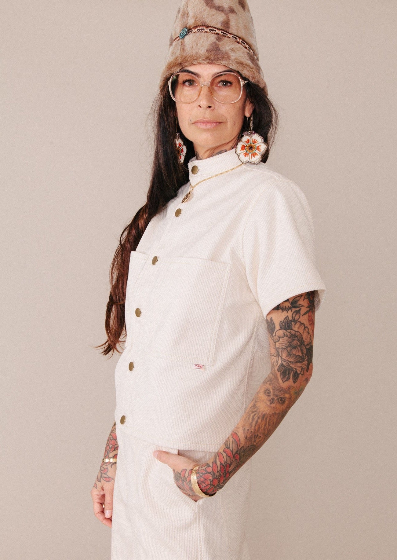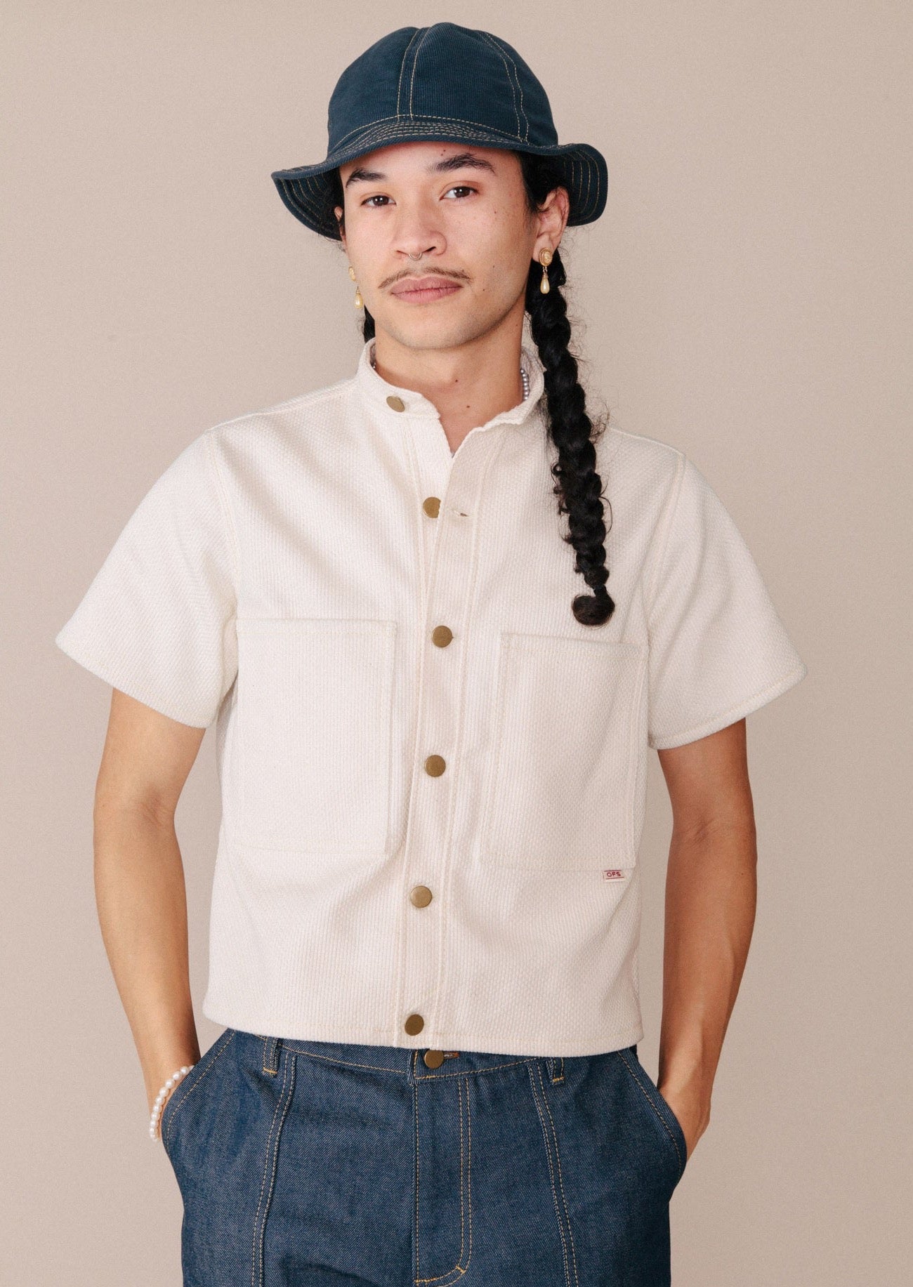 The Table for Two Top is a dressed-up mock neck shirt, designed to be the perfect dinner date top. Made with a beautifully chess woven, cream-coloured, Shashiko cloth, this short sleeve button-up has two front pockets and polishes up your look so you feel cute as heck going to meet your honey for a reservation at your favourite restaurant.