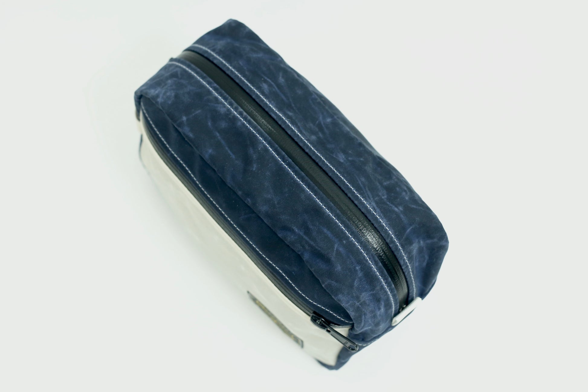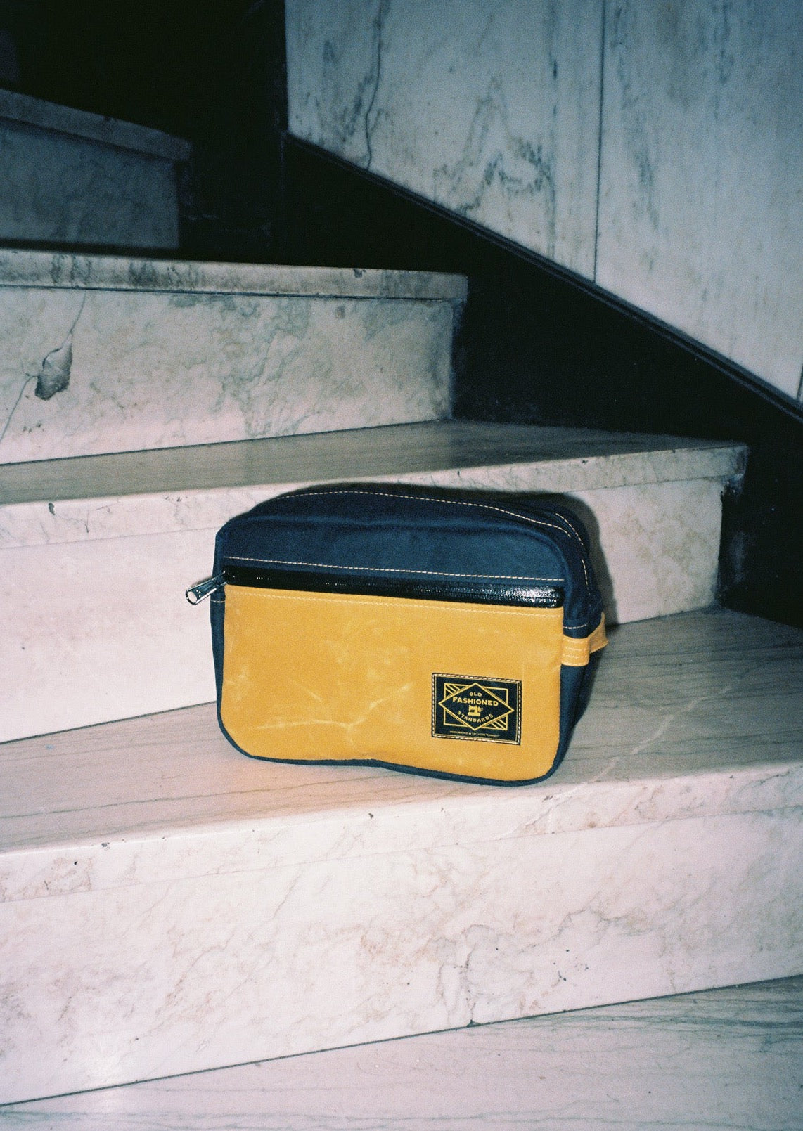The shower room carry all. Made in durable and waterproof waxed cotton, lined in a waterproof pvc, featuring waterproof zippers and a carry handle. No stress if spills occur, simply rinse out and carry on. This bag can fit all your essentials and mostly all of your non essentials.