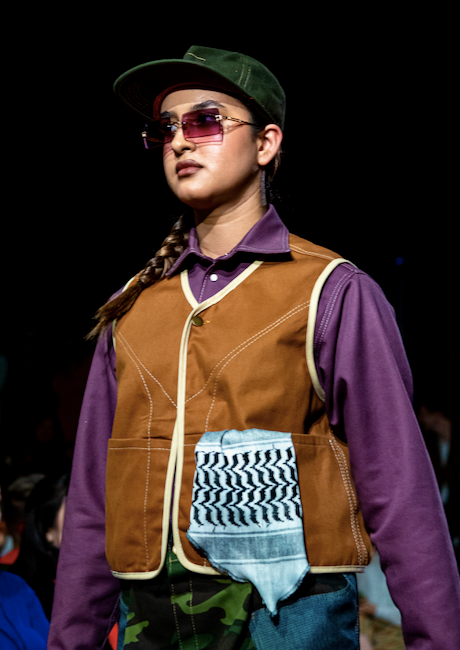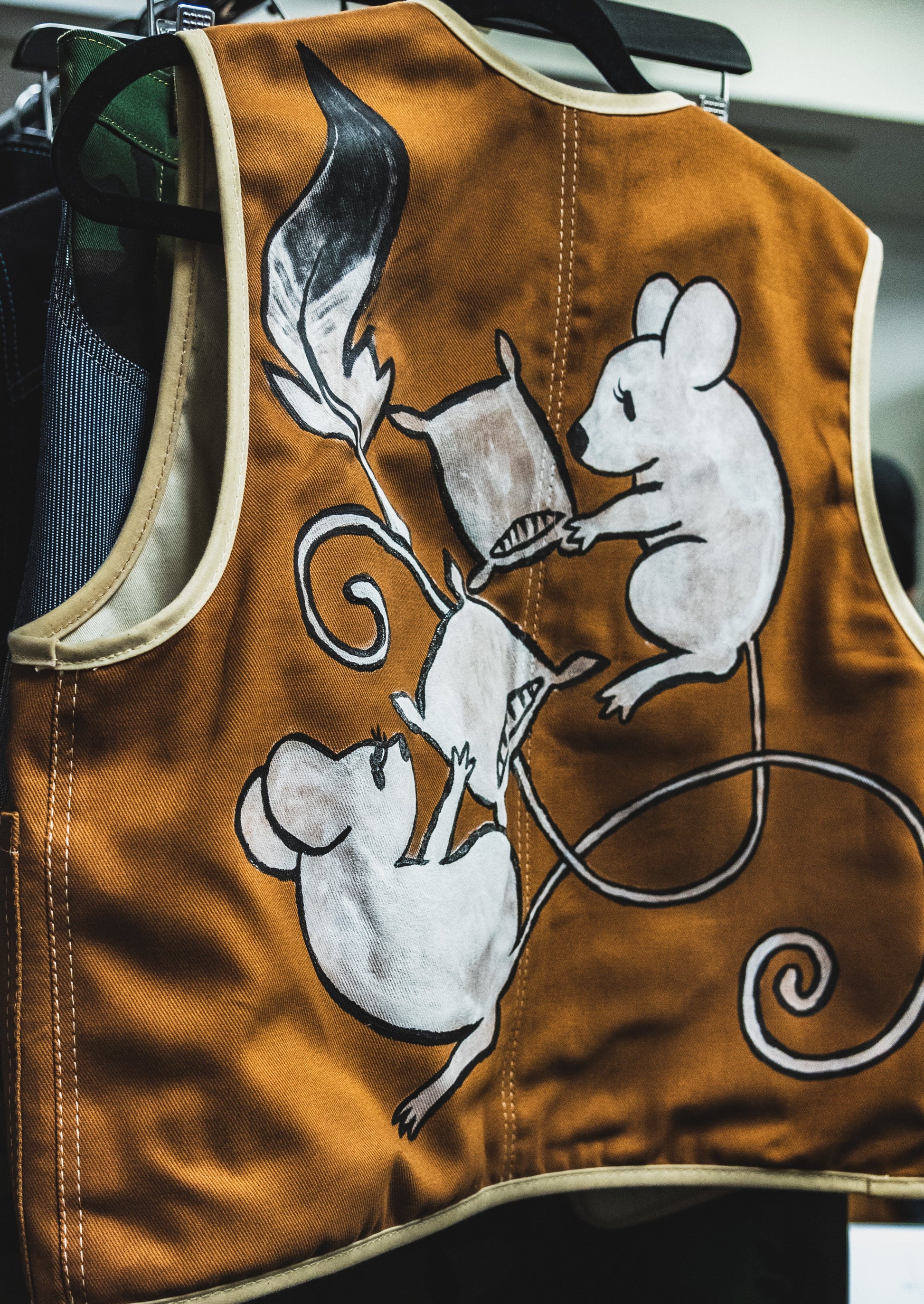This 3 piece utility set features a dusty grape work sure, sewn in a 10oz bull denim. Layered with a brushed tobacco vest, hand painted by Nora Pape. Inspired by a my Gramma who even in her last few days, made up laugh. This vest imagery is from when my Gramma woke up from a nap, laughed and said there is three little mice in the corner have a pillow fight. Her cadence brightened the room as she always did. The long utility skirt is also made in ode to my sweet Gramma, who worked hard all her live, and loved a long skirt.