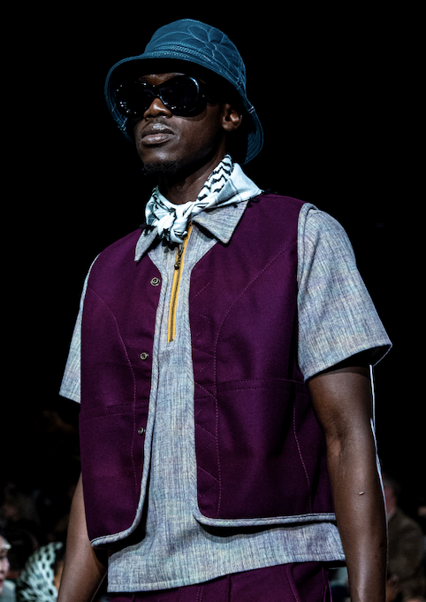 Mid weight, elevated, warm and approachable. This up-cycled one of one set is daper, cozy but not to warm and perfectly suited for fall and winter. Generous fit this trouser style bottom is pattern off the fancy pant cut if you are familiar. The vest is a boxier cut hitting you right at the bend of your hip. Sewn with 4 utility style drop pockets. Wear it open or snap it up. Shirt is our in house purple tweed summer nights shirt.